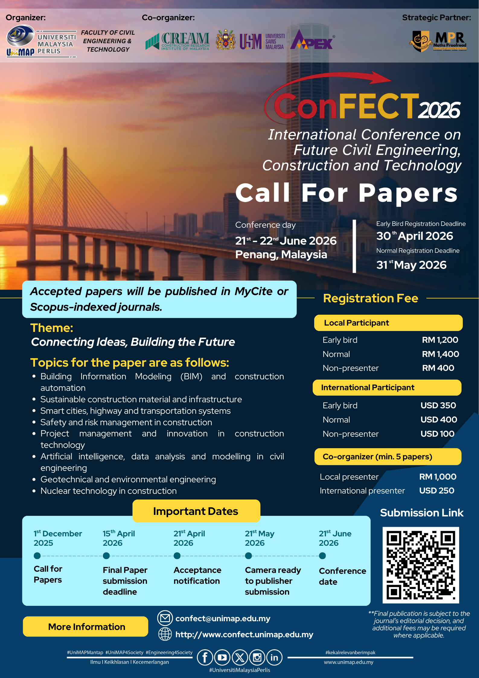 With rapid advancements in technology and the construction sector increasingly embracing digitalisation, the pursuit of innovative and sustainable solutions has become more critical than ever. In response to these evolving trends, the Faculty of Civil Engineering & Technology (FKTA), Universiti Malaysia Perlis (UniMAP), is proud to organise the 1st International Conference on Future Civil Engineering, Construction and Technology (ConFECT2026). This inaugural conference provides a key platform for academics, researchers, and industry professionals to exchange ideas, explore breakthroughs, and discuss the future direction of the civil engineering discipline.